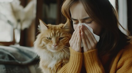 Young woman with an allergy to cat hair blows her nose in a napkin at home. Allergy concept