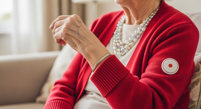 Senior Woman's Wrist and Red Medical Alert Device, Elderly Safety, Health Monitoring at Home