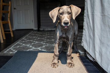 Funny studio portrait of cute smilling puppy dog border collie isolated on blue background. New lovely member of family little dog gazing and waiting for reward. Pet care and animals concept