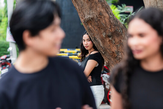Suspicious young woman hides behind tree, staring intensely at her crush chatting closely with another woman in a public space.