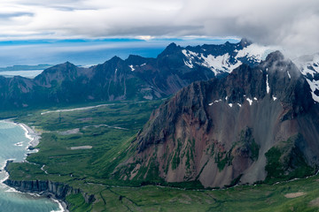 Aerial view of the volcanos and Aleutian Range of Mountains in Southwest Alaska