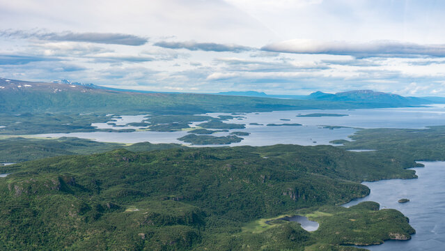 Aerial view of Lake Iliamna with islands, Aleutian mountain range and reflection. Near Pedro Bay, Alaska.