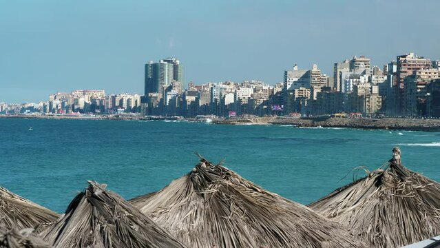 Sea coast of Alexandria. Seashore of ancient city of Egypt with buildings, constructions. Urban view of seaside with houses