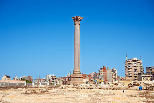 Pompey's Pillar, an ancient Roman triumphal column dating from 297 AD and dedicated to Emperor Diocletian, rises above the city of Alexandria, Egypt.