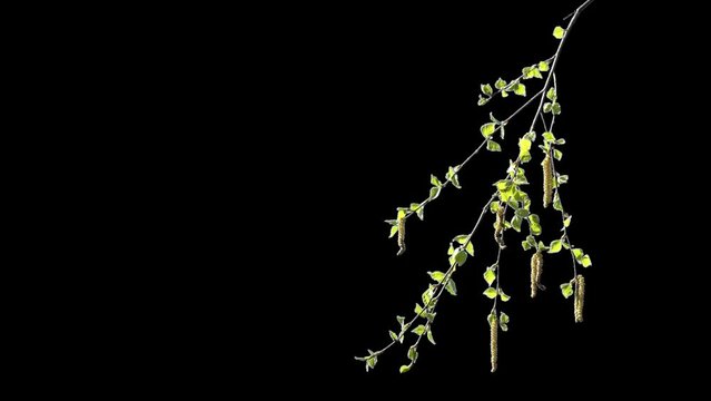 Young tree branch with sprouted green leaves with alpha channel spring landscape in sunny weather