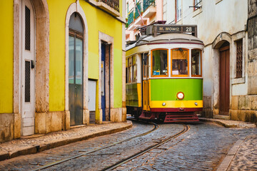 Famous vintage yellow tram 28 in the narrow streets of Alfama district in Lisbon, Portugal - symbol of Lisbon, famous popular travel destination and tourist attraction