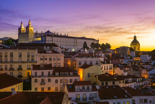 Colorful buildings of Lisbon historic center near landmark Rossio Square