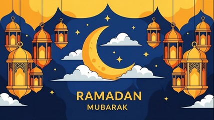 Ramadan Mubarak Celebration with Golden Lanterns and Crescent Moon.