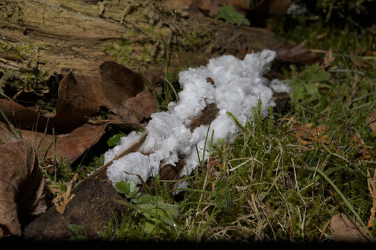Bad Karlshafen, Germany - 01/23/2021: Wonder of hair ice on a deadwood branch in the forest between grass, moss and leaves.