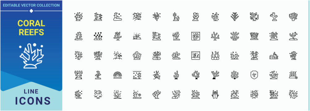 Coral Reefs vector icon set. Marine icon set. Minimal icons set. Pictograms of life, aquatic, underwater, sea, marine, coral and more. Editable stroke. Pixel Perfect.
