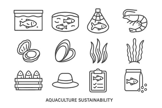 Aquaculture Icon Set. Outline icon set of aquaculture sustainability: fish tank, pond, net, shrimp, oyster,