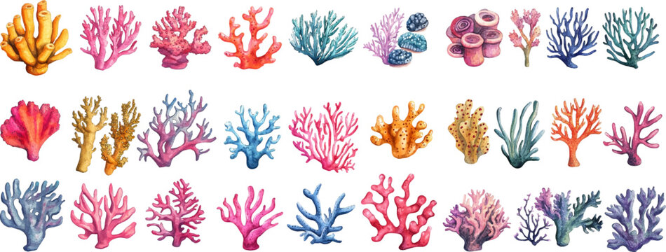 Watercolor set of sea corals png. various sea and ocean corals in watercolor style. Concept of sea and underwater flora. Marine theme, design element, decoration of water attractions, parks, beaches.