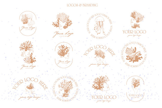 Collection logotype of woman face portrait, underwater world, seaweed and marine animals. Minimalistic objects one linestyle. Editable Vector Illustration.