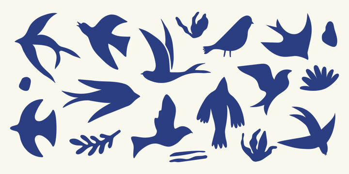 Abstract birds. Simple bird silhouettes, minimalistic hand drawn folk decorative birdy elements and organic shapes for pattern sticker print design. Vector isolated set