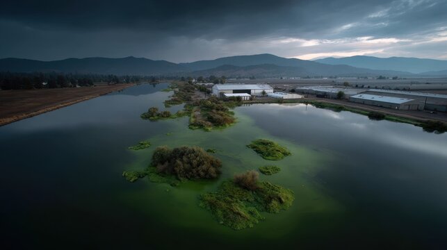 Industrial agriculture runoff causing algal bloom in lake under moody sky