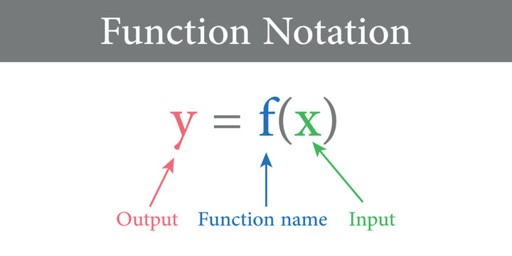 Function notation in mathematics. Function name, input and output value.