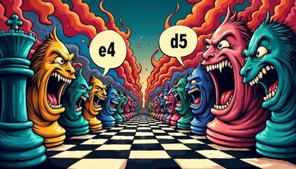 Grotesque cartoon chessboard with animated squares shouting algebraic notations in vibrant colors
