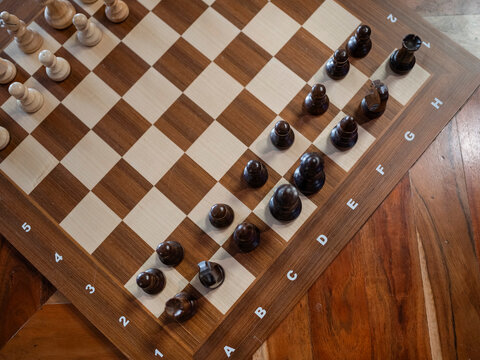 Top view of chess game in progress on board with algebraic notation showing captured pieces and active play