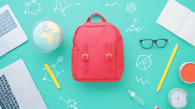 academic scene featuring vivid red knapsack, geographical sphere, yellow pencil, eyeglasses, sleek laptop, forest green board filled with chemical structures and algebraic notations, soft natural