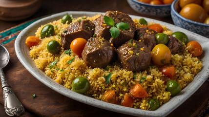 Ultra HD image of an Algerian couscous dish with vegetables and lamb stew
