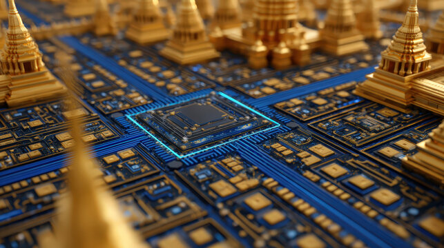 Social Justice Algorithmic Bias Concept, Circuit board layout with algorithmic social justice bias concept showing golden pagoda elements blue PCB