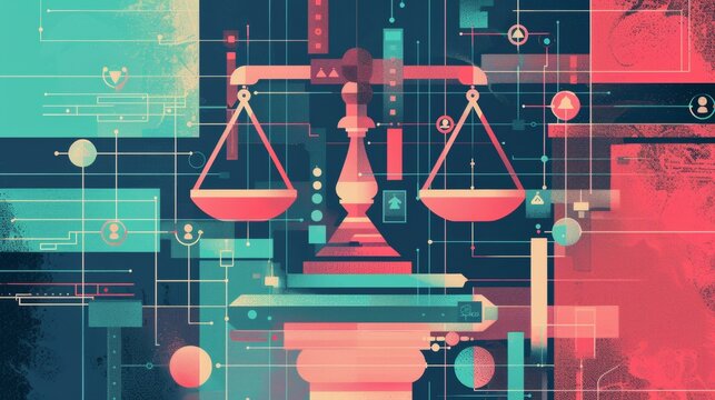Digital scale balancing justice and bias in the age of artificial intelligence with glowing algorithmic patterns and cybernetic textures