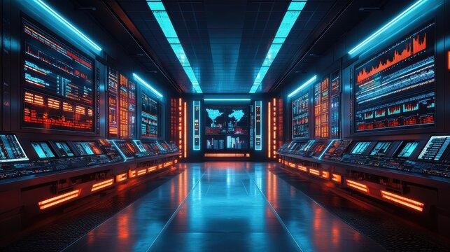 Financial trading floor with glowing data streams and automated systems, symbolizing AI in finance, with copy space for text