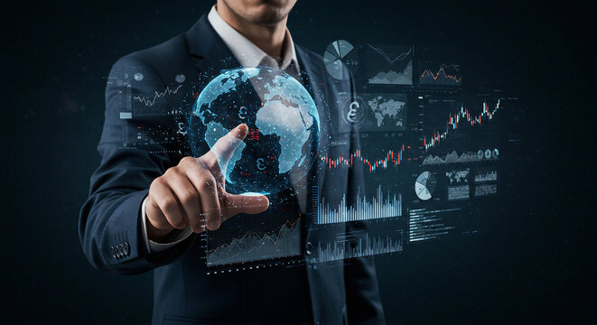 Executive Analyzing 3D Holographic Global Market Data in a Sci-Fi Setting