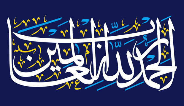 Alhamdu lillahi rabbil alamin, ayat quranic verses hadit, islamic muslim, vector art design khattati calligraphy multi color isolate on blue background wallpaper design
