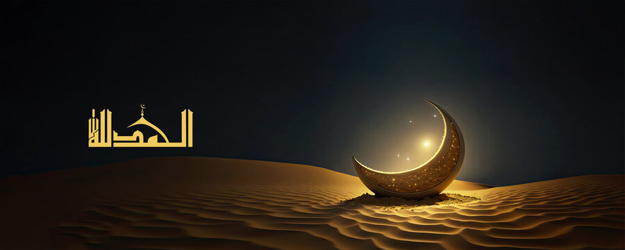 Arabic Calligraphy of Wish (Dua) Alhamdulillah (Praise Be To God) And 3D Render, Golden Crescent Moon On Sand Dune. Banner or Header Design.