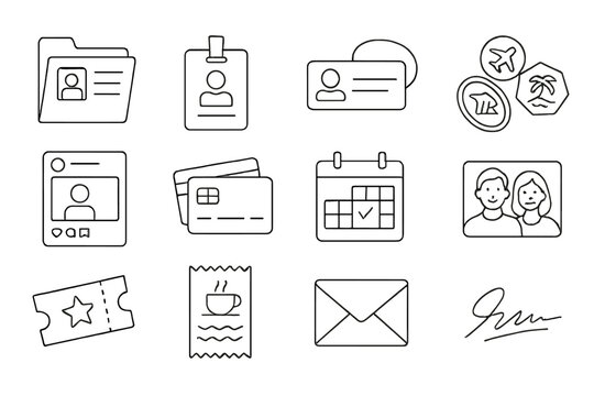 Spy Essentials Icons. Line style icons of cover story elements: fake backstory file, job ID badge, nameplate with alias, travel