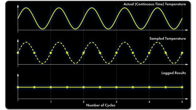 Timebase plot showing continuous signal, sampled signal, and aliasing (sampling 2X signal frequency, below Nyquist rate)