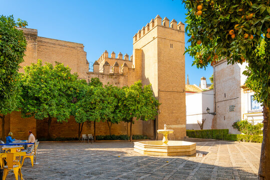 The Plaza de la Alianza at the Royal Alcazar, Taifa Gate and Blue Tile of Christ of Mercy, in the Barrio Santa Cruz district of the Andalusian city of Seville, Spain.
