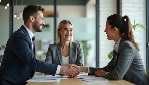 Un apretón de manos entre un hombre y una mujer de negocios en una reunión en la oficina, concepto de alianza, entrevista laboral o asesoramiento financiero