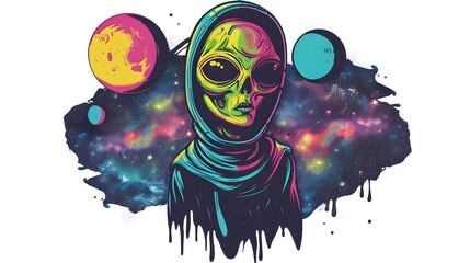 Quirky Space with Alien Encounters Sticker Design for Shirts on White Background