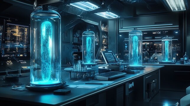 A futuristic lab where scientists are studying alien life forms, with glowing jars and advanced scientific tools