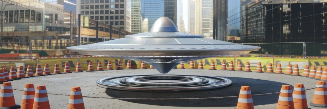 Silver UFO Surrounded by Construction Cones and Barriers - 3D Illustration