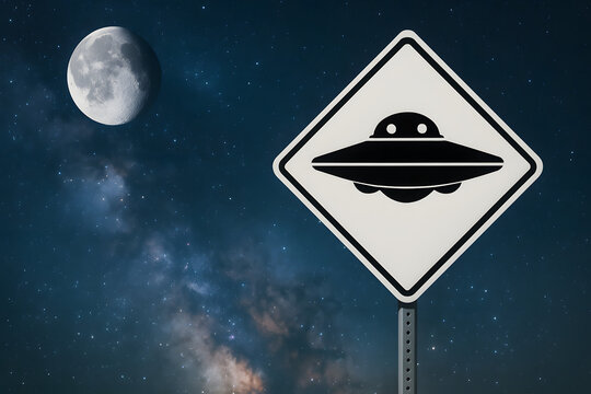 UFO warning road sign under night sky with moon and stars, alien activity alert concept in outer space, extraterrestrial symbol caution signal, mysterious space travel and sci-fi fantasy background