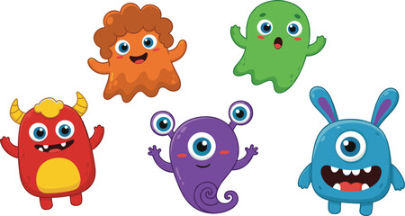 Cute cartoon monster characters collection, colorful fantasy aliens with one eye, horns, funny expressions, vector design for kids illustration