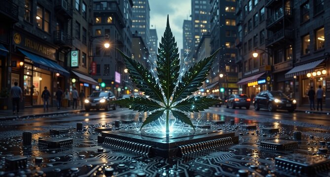 Futuristic Digital Evergreen Tree Rooted in a Glowing Circuit Board with Snow Patches