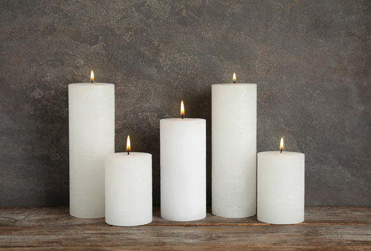 Alight wax grey candle with flower petals and pebbles on wooden background