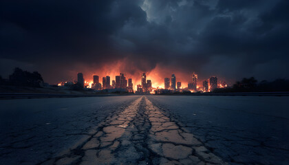 Cracked road leads towards burning metropolis at night under dark, ominous clouds. Flames engulf landscape bordering highway, with city skyscrapers ablaze in background, creating scene of urban