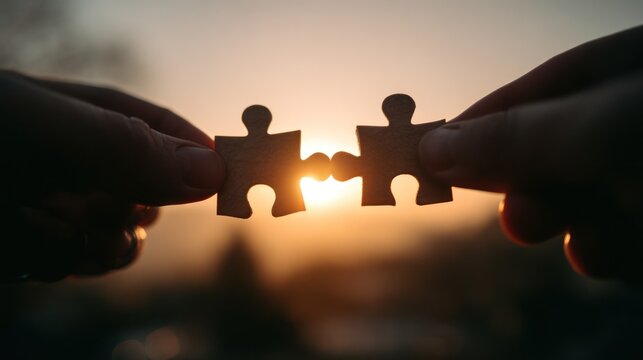 Puzzle pieces align in hands with sunlight piercing through in blurred background