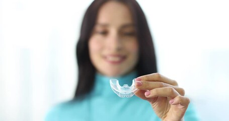Invisible orthodontics cosmetic brackets on gradient background, tooth aligners, plastic braces. Modern teeth retainers created on a 3d printer. A way to have a beautiful smile and white teeth.