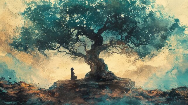 A serene figure meditating, surrounded by vibrant energy, embodying peace and spiritual awakening in a cosmic backdrop