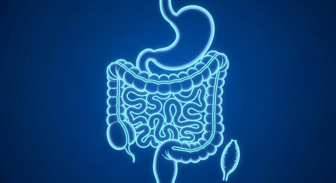 Photo of a neon blue outline of the human digestive system, including the stomach and intestines, glows against a dark blue background
