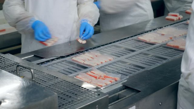 Crab sticks are getting packed by the factory staff