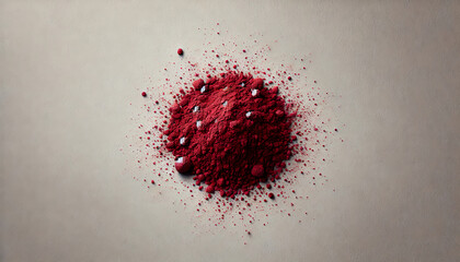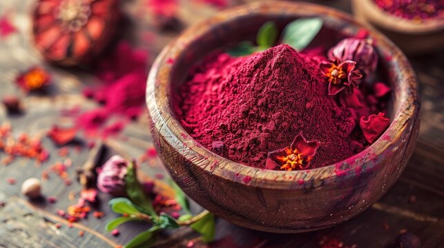 A vibrant bowl of alizarin crimson pigment surrounded by natural elements and wooden textures in a rustic setting