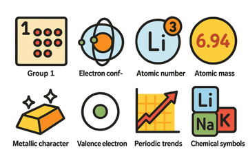 Alkali Metals Icons. Flat vector mini-illustrations alkali metals in periodic table in colors children's illustrations: group 1