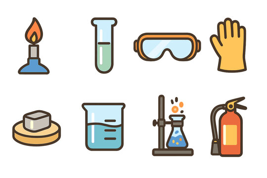 Alkali Metals Lab Icons. Flat vector mini-illustrations alkali metals in lab in colors children's illustrations: Bunsen burner,